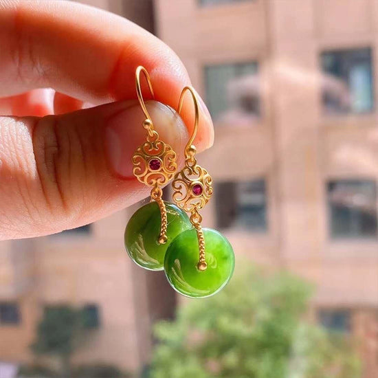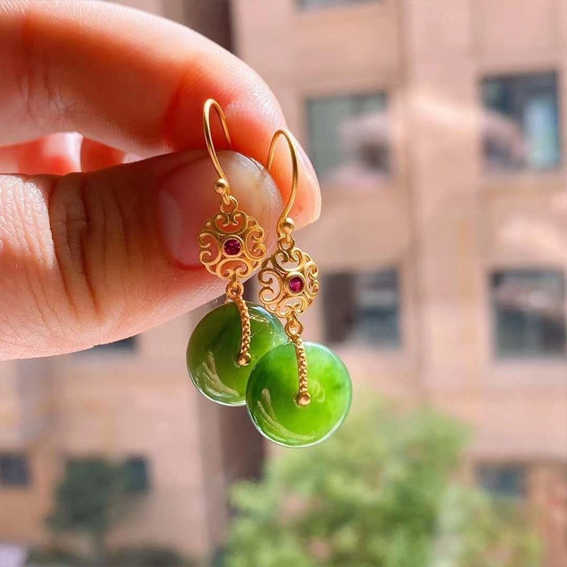 Carved from authentic Hetian green jade, these earrings feature the classic Ping An Kou (peace-buckle) disc—an ancient talisman symbolizing safety, protection, reunion, and the unbroken flow of blessings. The serene green of Hetian jade is traditionally cherished for calming the heart, balancing emotions, and inviting harmony and good fortune into daily life.