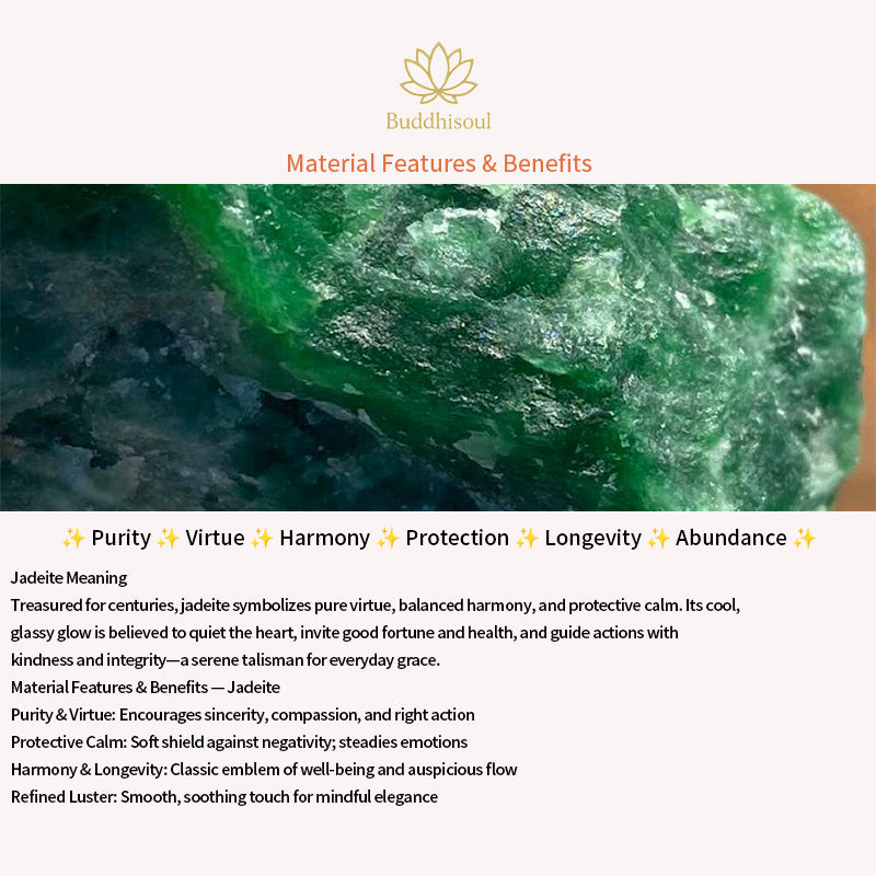 Traditionally cherished for attracting good fortune and warding off negativity, jadeite is associated with harmony of mind and heart, steadiness, and gentle growth. -