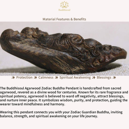 The Buddhisoul Agarwood Zodiac Buddha Pendant is carefully handcrafted from natural agarwood, a sacred material valued for its calming fragrance and spiritual protection. Each pendant is intricately carved with the image of a Zodiac Guardian Buddha, believed to offer blessings, protection, and guidance based on your Chinese zodiac sign.