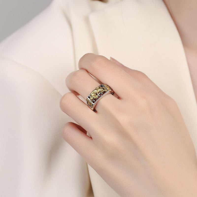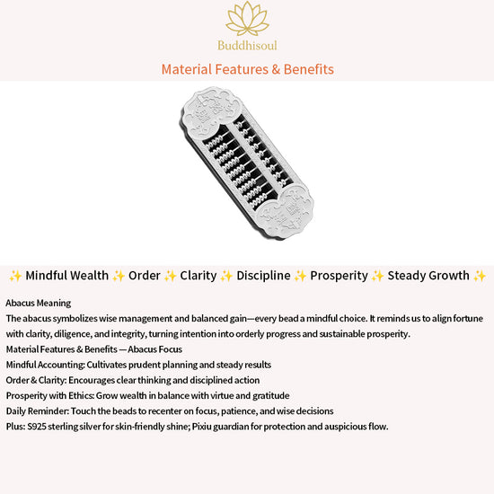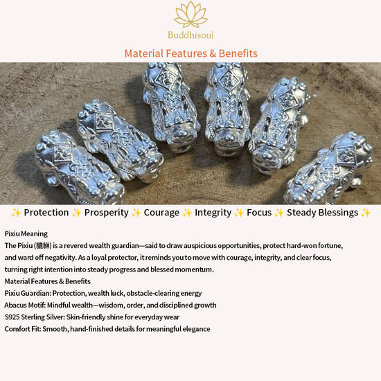 Handmade in luminous S925 sterling silver, this ring pairs a sculpted Pixiu (貔貅)—the classic guardian of prosperity—with an abacus motif, symbolizing wise management and balanced gain. Together, they form a meaningful talisman for protecting blessings, inviting auspicious flow, and guiding decisions with calm clarity.