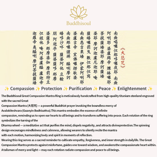 The Buddhisoul Rotatable Great Compassion Mantra Ring is a spiritual masterpiece crafted from high-quality titanium steel. Engraved with the sacred Great Compassion Mantra (Mahākaruṇā Dhāraṇī), this ring embodies mercy, wisdom, and protection.