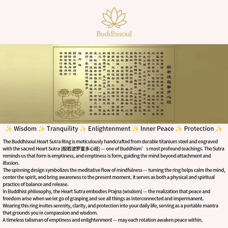 The Buddhisoul Titanium Steel Rotatable Heart Sutra Ring features a sleek, rotatable design engraved with the sacred Swastika (卍) symbol and Heart Sutra (心经) mantras. Handcrafted from high-quality titanium steel, this ring symbolizes wisdom, protection, and eternal peace.